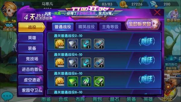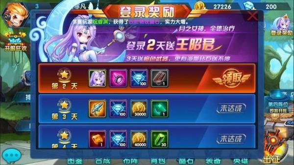 进入游戏后,玩家首先要打开“登录奖励”界面,因为游戏为玩家每一天的登陆都准备了丰厚的奖励,就如同其他游戏中的每日签到功能一样,每日登陆进行点击签到就能领取包括钻石和稀有装备在内的礼品。开服狂欢同样是玩家的最爱,在这里玩家通过任务要求完成通关、升级等一系列任务就有豪礼相赠,而且任务丰富,可以长久参加,绝对是平民玩家不容错过的福利。