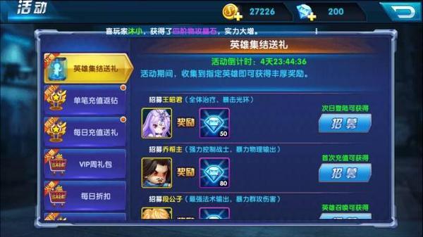 在“活动”系统中,游戏为玩家准备了诸多消费返礼的活动,比如累积充值有奖活动,从300钻开始,充值钻石的数量每满一定的数额就能领取礼盒、金币等奖品。还有单笔充值返钻、累计消费有奖、每日折扣等等。打算长期驻守游戏的玩家一定要及时关注游戏内的各种活动,日积月累之后就能成为一笔不小的财富,对于玩家的日常游戏将起着莫大的作用!