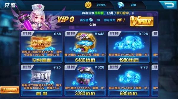 钻石的获取方式比较单一,充值是最快捷也是最常用的一种方式。对于小R玩家来说以购买福利卡的方式获得钻石是最佳的充值方式了,便宜实惠非常划算。月卡分为两种,一种价值25元的普通福利卡,购买后即可获得250钻石,每日额外获赠100钻石。另一种是68元至尊福利卡,购买后即可获得680钻石,之后每日获赠120钻石,持续30天。如果是土豪玩家的话,那么直接充值就成为最好的钻石获取途径了。游戏中人民币与钻石的兑换比率为1:10,也就是说玩家充值1元人民币即可获得10颗钻石,从6元到648元一共6种套餐可供玩家选择。值得一提的是,每一种套餐首次充值都有三倍钻石的奖励,比如说玩家第一次充值6元那么总共能获得180钻石,以此类推。