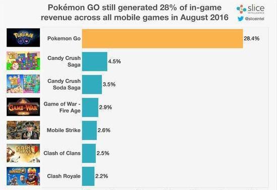 【119you整理报道】《Pokemon Go》(《精灵宝可梦Go》)的起点高到让所有游戏都望尘莫及的地步,上线之初为移动游戏市场输入了大量的新用户,付费用户的迅速飙升让整个美国手游市场的付费用户数量翻了一倍。不过,近日市场研究公司Slice Intelligence的最新报告指出,《精灵宝可梦Go》的游戏内付费用户相较于今年7月15日时的高峰期,下滑了将近79%。但是《精灵宝可梦Go》8月份依然拿下了美国手游市场28%的收入,是排在第二名的《糖果传奇》的6.3倍。截止至9月3日,依然有25%的玩家在游戏中进行消费。