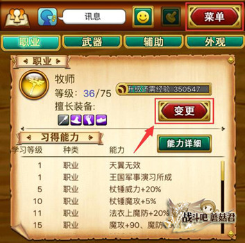 点击主界面菜单>装备>职业>更变>选择喜欢的职业便可进行转职。