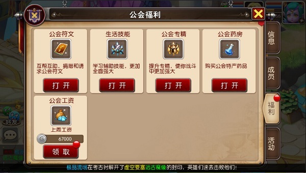 加入公会不但能给你带来各种工会技能,也能给你带来满满的福利,其中就包括一周一次的公会工资。这个公会工资就隐藏在公会福利的最下方,一旦错过就只能再等一周。做公会任务的朋友们在忙碌之余也不要忘记领取自己那份应得的报酬哦!