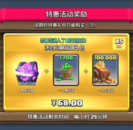 同时,游戏通过限时特惠进一步放大了付费带来的收益,最大的体现莫过于竞技场礼包。玩家每进入一个新的竞技场,商店就会刷新出一个仅能购买一次的特惠竞技场礼包。竞技场礼包往往会带来支付费用5倍以上的收益,以我在八阶竞技场时的刷新的礼包为例,68元将同时获得八阶神奇宝箱、1200宝石和10万金币,而平时,68元只能购买1200宝石,10万金币等同于4500宝石。这种大幅度的优惠在之前是前所未有的,同时Supercell又毫无意外的让它成为了“随机出现”。《皇室战争》通过这种设定将特惠活动玩成了一场心理博弈,放大玩家对于礼包的期待值,并在有限时间内促成消费。玩家乐意掏腰包的同时,也促成了《皇室战争》一经更新就蹿升至畅销榜TOP2的景象。