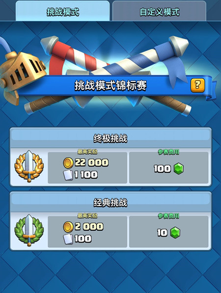在《皇室战争》里,现在的锦标赛被区分为挑战模式和自定义模式。在挑战模式中,玩家可支付10宝石或者100宝石开启挑战,门票费用决定了对应胜场的奖励额度,并不影响实际的挑战难度。同在挑战池中的玩家会根据实力进行匹配,玩家胜场越多,奖励越高,12胜封顶,战败3场比赛结束。说白了,这个挑战模式规则与《炉石传说》的竞技场如出一辙。