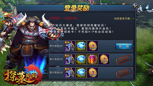 活动内容:玩家每天登录游戏都可领取大量钻石,次日登录赠送周卡,还有绝版紫将牛魔王、强力金装红装等海量福利赠送!