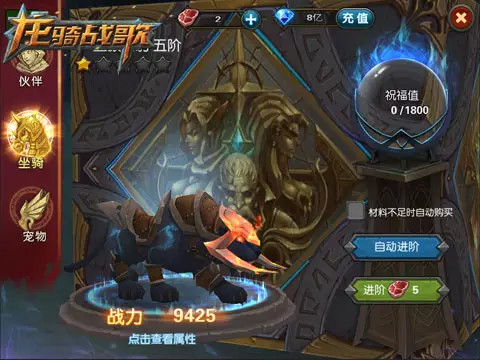 《龙骑战歌》中的坐骑进阶失败时,会产生祝福值,提高下次进阶成功几率,祝福值越高进阶成功率越高,祝福值达满值时,进阶将100%成功。另外,《龙骑战歌》的坐骑可以给玩家提供基础属性加成,其中包括攻击、防御、移动速度3种属性。坐骑升级后相应的加成数值会增长,升阶还可获得新的属性条目。玩家在战斗中可以点击坐骑按钮召唤坐骑进行协同战斗,角色变为乘骑状态,大幅提高玩家的伤害。坐骑的等级越高,被召唤后乘骑的时间就越长。骑乘状态下角色原有技能会替换为坐骑的相应技能,具体技能则根据坐骑形态确定,使玩家体验到酣畅淋漓的战斗快感。
