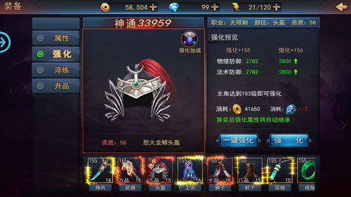 接下来,我们就该考虑装备、技能、坐骑、羽翼、伙伴等的进阶强化事宜了,玩家如果高质量的完成了以上三步,那手中的装备、铜钱、钻石等等资源一定不会少,下面就开始愉快的进行升级和强化把!把屏幕上的红点统统消除,你的实力会有质的飞跃!不过需要提醒的是,若是现有资源有限,我们还是要择优而升!