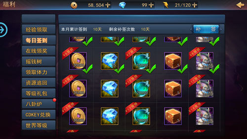 游戏是一条由易到难的道路,因此在游戏的前期我们可以非常轻易的达成各种成就、任务,奖品福利将会拿到手软;而在“精彩活动”以及“福利”选项中,亦罗列了十余项福利活动,如签到、在线领奖、等级礼包、体力、摇钱树、今日特惠等等,每天都能领取大量奖品!收获这些财富并合理运用它们,你会发现你已经将你的对手甩下了很远。