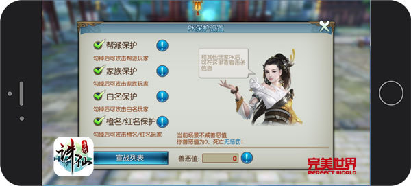 需要各位仙友修炼至30级以上,即可与高手一较高下。在《诛仙手游》主界面的右上方,主界面的【PK】按钮可进入PK设置界面。该界面有帮会、家族、白名、橙名/红名四种保护,勾掉之后就可以攻击相应群体。