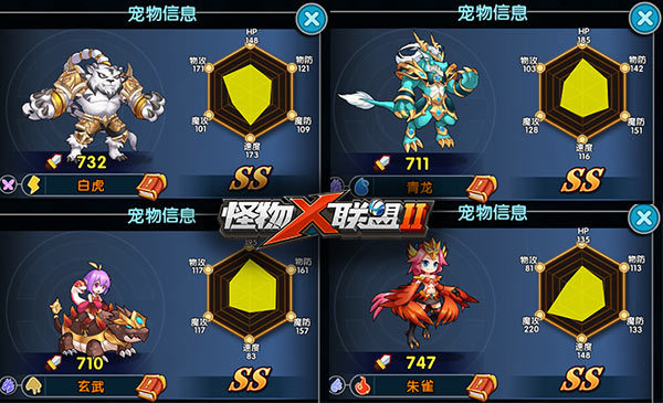 四大神兽分属雷、土、水、火四系,朱雀是火系魔攻专家,强悍的攻击力能让对手望而却步。青龙、玄武则分别代表水系、土系优秀肉盾,可以说过是一夫当关万夫莫开;而外形酷炫的白虎则是雷系速度之王,往往能杀人于无形;火系的朱雀则是顶级的魔攻高手。四只神兽都至少有三个A级以上的技能,非一般宠物可以匹敌。四大神兽虽强,但产出途径还算十分的平民,通过正常的扭蛋抽取、运营活动,均有机会获得。