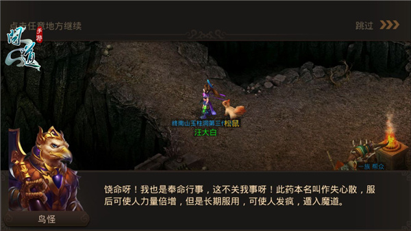 到达轩辕坟二层时,发现原来是有鸟怪冒充神兽异人,打败鸟怪后,方知此药名为“失心散”,服用后可使人力量倍增,但长期服用却会使人发疯,遁入魔道。幕后指使还未追问出来时,愤怒的神兽异人鲁莽将之诛杀,线索似乎又断了。无奈之下,你和神兽异人分别前去通知得到此药方的人,避免失心散流落人间,祸害百姓。