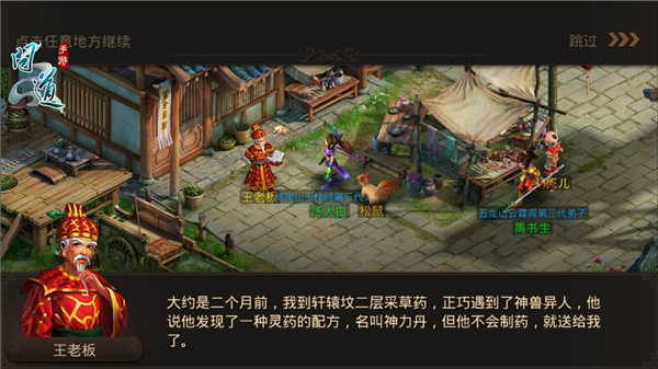 一番赶路,你来到揽仙镇找到王老板,将杜卜思的吩咐一字不差地告诉王老板且将神力丹交予他。王老板一看丹药便惊讶地将它认出,原来此前丢失的药材便是用来炼制此药,他也打算凭此药方赢得赌约。看来事有蹊跷,大约两个月前,王老板到轩辕坟二层采药时遇见了神兽异人,神力丹的药方便是他所赠。
