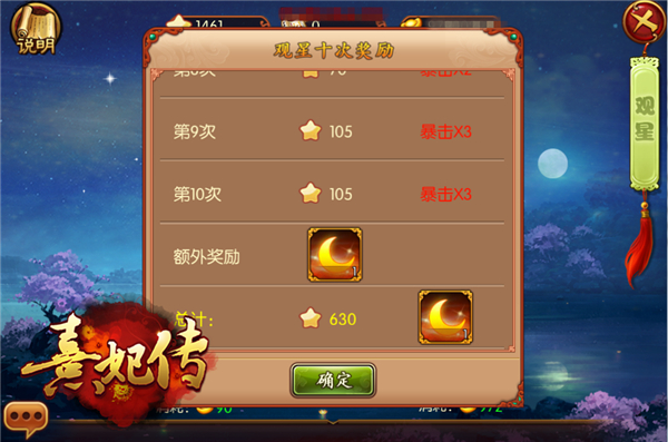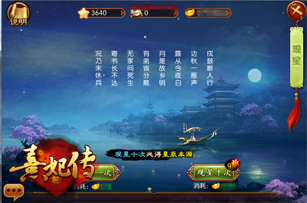 小主夜登观星阁,通过观星寻获点星道具星辰之力和星辰本源,为宫廷随从们再寻突破实力的点星途径。观星所获星辰之力有一定暴击几率,可获得数倍星辰之力,而一次性进行10次观星将能获得十分稀有的星辰本源。夜阑风轻,微波轻漾,湖光月色相映,吟赏风月,仰观星辰若何。
