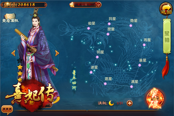 观星得星辰之力,可用来点亮星辰,为随从带来各方面属性的大幅提升(随从星相不适用于主角角色)。依据所点亮星辰的不同,获得的属性加成自然也不同。当完成一阶的点星后,随从将面临点星突破升阶。此时则需要星辰本源进行突破,如若小主此时已攒够突破材料,则可以进行突破。反之,则需再接再厉,刷取更多点星材料。