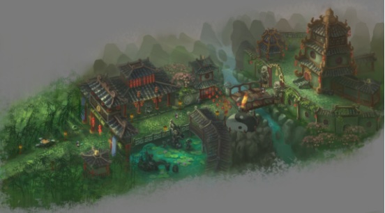 绿荫缤纷的神秘国度,无论是山顶上的阴阳鱼标志,还是这竹林丛生的优越环境,简化的竹式建筑,每一处细节暗示着这个神秘的国度的拥有者是谁。