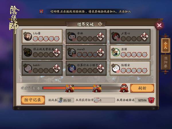 个人结界突破中,玩家可以根据个人等级随机匹配9名玩家进行挑战,挑战胜利后可以获得金币、勋章及其他随机奖励,而每成功突破3个结界,还可以获得额外的勋章和勾玉奖励。需要注意的是,挑战对手的勋章数量也代表了对手了防守实力,可以通过勋章数量和等级对对手进行基本的实力判断。
