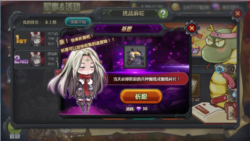 我们都有一个大国梦,但建造大国梦的前提我们也会有许许多的小愿望。在《那兔之大国梦》本次更新后,全新添加的“祈愿”功能就满足了玩家们的愿望,祈愿后当日进行挑战麻蛇,必掉所祈愿的图纸或图纸碎片。所以想要什么“板砖兔”、“AK熊”、“黑衣鹰”、“竹刀鸡”的,机会来了,记住:祈愿即会实现。分分钟让你拥有一只武力超群的橙色部队。同时,玩家在每日首次进行祈愿时无需消耗任何资源,良心满满有木有。