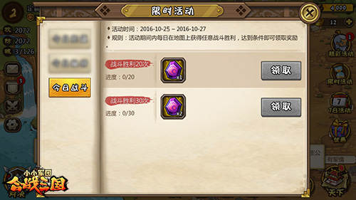2016年10月25日至2016年10月27日,《小小军团合战三国》限时活动开启,每天完成指定任务均有丰厚的奖励。任意战斗胜利20次?小意思!完成后就有超值道具可领取,活动时间有限,各位主公抓紧战斗!