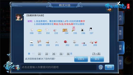 说到表情,那就不得不提游戏中隐藏的表情包了,作为聊天撩妹的必备道具聊天表情,可不仅仅只有聊天栏目中的那么多,其实还有大量的“隐藏”表情等着你去寻找。少侠只需要找到倩女小精灵,输入关键字“隐藏表情代码表”即可召唤出海量逗趣的表情,聊天时输入#和对应的数字编码就能让这些调皮捣蛋的表情包子为你所用。