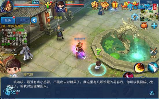 天气渐冷,我们的淘气包却在万圣节前夕生病了。机灵的他立马向少侠们求助,你会忍心拒绝么?愿意施加援手的少侠,将获得一些易容丹,吃了之后就会变成各种鬼怪的样子去帮他讨糖果。不过,讨糖果的路,可是并不好走的哦。比如,一向抠门的武海遇到你们就会狂暴变身,这时候就不要手下留情了。当然,如果你变成了可爱的灵兽,跟恒娘撒撒娇,没准就有意外惊喜。把讨到的糖果交给淘气包,心满意足的他就会送上超多奖励。
