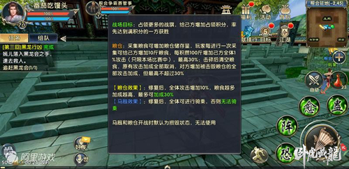在战场上,双方除了争夺战旗要展开厮杀以外,还需要注意另外两个影响战局的重要因素,就是粮仓和马厩。其中粮仓的效果为给全体增加攻击力,每积攒100斤增加己方全体1%攻击(只限本场比赛中),最高30%。马厩的效果为全体可进行骑乘,方便玩家快速到达战场。需要注意的一点是马厩和粮仓开战时默认为损毁状态无法直接使用,需玩家修复。