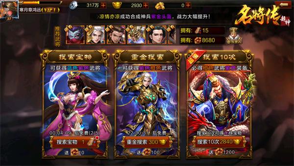 在《超神名将传》中,获取武将最简单、最有效的方式莫过于寻宝啦!寻宝按照不同的等级、方式,可以分为搜索宝物、重金搜索、搜索十次。搜索宝物是免费的,玩家有机会获得蓝色、紫色武将;重金搜索每天免费搜索一次,其他时候是要消耗元宝的,玩家有机会获得紫色、橙色武将;搜索十次则更给力,玩家必得橙色武将、紫色装备!