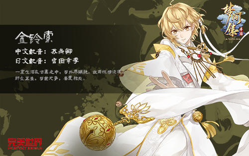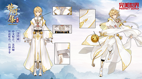 在《梦间集》手游中,金铃索一头金发,体型小巧可爱,身上带有铃铛装饰,走起路还会有叮叮当当的铃铛响声。衣服质感很强,光滑飘逸,绣有精细的花纹。画师用干净整洁的白色系衣着,为金铃索营造出高洁空灵,神圣不可侵犯的感觉。