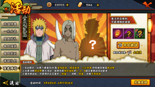 活动内容:扫荡副本或参与小队突袭即有几率获得挑战券,进入活动中心→强者降临,使用挑战券就有机会使用四代火影以及三忍中随机一位忍者挑战对手!