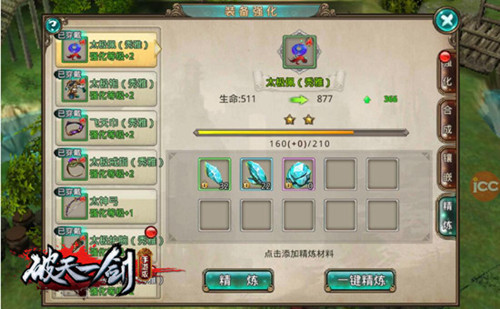 当然,只提升等级是不够的。在游戏中想要提升战力,最重要的还是自身装备的加强。《破天一剑》手游中的装备永久保值,所以可千万不要小瞧你手中现在不起眼的装备。等你拥有了各种神秘道具,就可以对装备进行合成、强化、镶嵌、精炼,让他变的更加强力了。