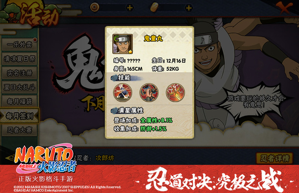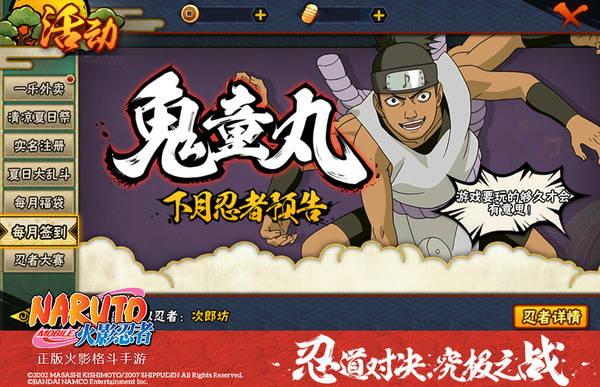 8月签到免费获得,音忍四人众之鬼童丸参上!忍者学员们,赶快进行签到,第一时间将这个强力忍者招入麾下,开发出他所有的战斗潜力!