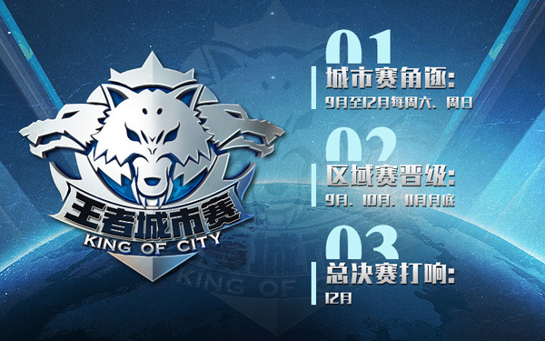 从9月3日至12月初,每一周的周六、周日都有城市赛精彩相随!一周一城市、一周一冠军,人人参与电竞,全面满足线下参赛的用户需求。9月底的南方大区区域赛、10月底的北方大区区域赛、11月底的华西大区区域赛,将从城市王者中选拔区域王者,将王者荣耀进一步升级!而从区域赛脱颖而出的六支强队将于12月初展开“城市赛总决赛”对决,争夺第二届王者城市赛头名宝座,同时参与到第二届《王者荣耀》职业联赛资格的争夺当中!