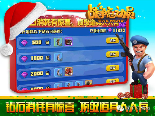活动内容:12月22日至1月4日,玩家在每天首次登录《战争总动员》,即可获得圣诞老人赠送的礼盒,开启礼盒后将获得大量金币。