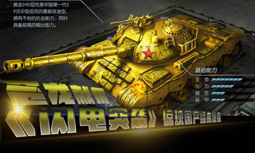 华夏天威,岂可轻犯。《闪电突袭》除了拥有基本的59-D坦克外,限量版黄金59-D同样引人瞩目。比较59-D,黄金59-D在战场火力,装甲厚度等方面更胜一筹。使得59-D系列在游戏中更进一步。遍及黄金59-D周身的云龙纹,彰显泱泱华夏大国气派。