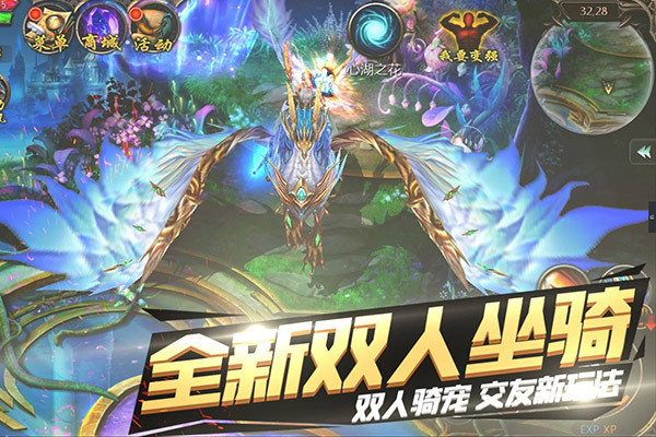 此次家族争霸资料片中还首次推出羡煞旁人的双人坐骑——龙鹰。给人以高贵感的白色、金黄和紫蓝搭配,光彩闪烁的特效,光是从龙鹰的外观就可以看出设计者的独具匠心,凸显贵族风范的同时,也有不怒自威既视感,绝对是和家族兄弟一起冲锋陷阵、和伴侣一起游山玩水广撒狗粮的不二之选。拥有双人坐骑的玩家,且不看战力如何,从气势上就足以形成碾压。