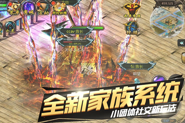 “家族争霸”玩法作为新资料片更新的重点玩法之一,可谓是一场史诗级的BOSS争夺战。在 “家族狩猎战”中,玩家们可以体验一把百人同屏竞技,混战热血狂燃的紧张与刺激。家族成员间不仅要通力协作击杀地图内的强悍BOSS,同时,还要防御其他家族成员的突然袭击。家族长在战斗中的作用也显得尤为重要,唯调动起家族成员的凝聚力,运筹帷幄,才能最终赢取丰厚的金银宝箱。