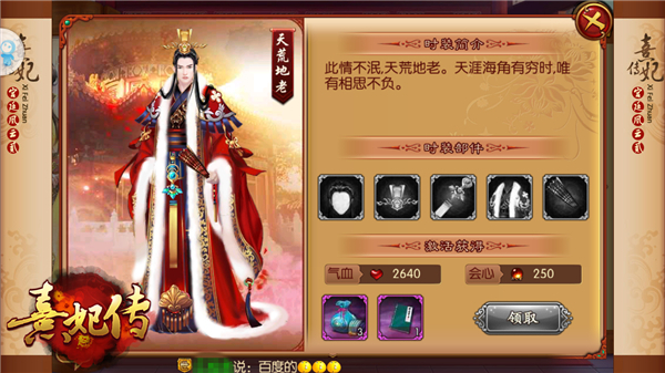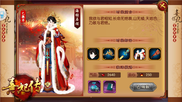 凤冠霞帔 白绒红袄海枯石烂、天荒地老,光从名字就可见其中的绵绵情意。华贵衣饰、极佳属性以及简单的获取方式,该套喜服可能是《熹妃传》的宫廷中最为受欢迎的时装了,也被诸多小主们戏称大红袍。凤冠霞帔,伊人红妆;赤霞白绒,君子无双。