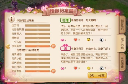 对于许多玩家而言,情人节无疑是一个最适合表白的季节。在活动期间,玩家只要在情缘纪念册中完成两道选择题和一道文字留言,即可将自己的心愿写入其中,并分享给其他玩家。而其他玩家也可以在活动界面-敞开心扉页面看到玩家的留言以及对应人气。也许在分享自己心愿的过程中,玩家也将找到属于自己的知音!