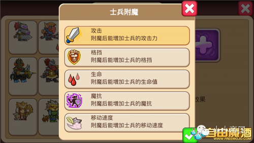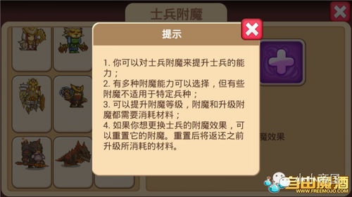 兵种附魔可以选择5种属性附加给某个兵种,只能选择一种附魔,可以花魔酒重置附魔,重置的话材料全部返还。