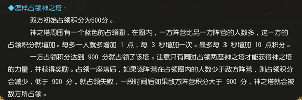神之塔是双方阵营必争之地。地图上一共存在两座神之塔,同时占领后即可全阵营获得百分比的生命和速度BUFF加成。当然了,占领后己方阵营将会变为追赶目标,对方阵营击败你后会获得更高的声望奖励。风险与收益并存,考虑完了就来战吧!