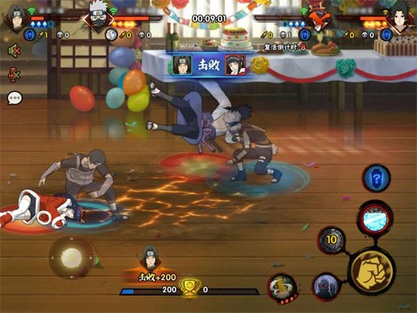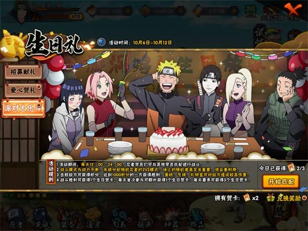 【派对大乐斗】:10月12日之前,每天12—14点,学员们可以与其他玩家进行战力平衡、系统随机分配忍者的2v2模式,对抗过程中不仅要比拼忍术格斗技艺,还有丰富的随机道具供对抗者拾取。战斗胜利即可获得生日贺卡、用以兑换各种忍者碎片、声望、忍界召集卷等珍贵奖励哟。