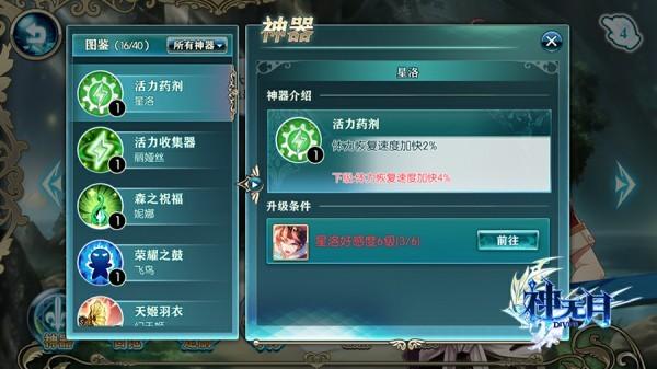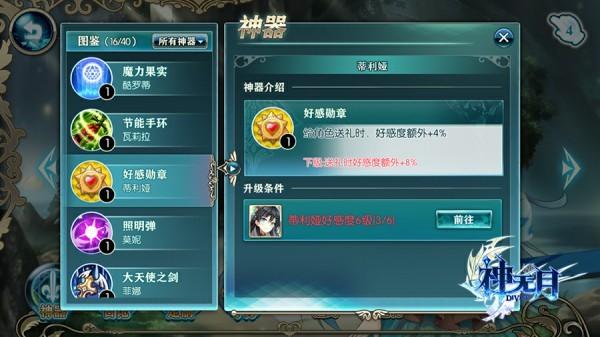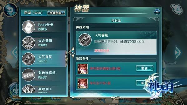 每位角色都拥有自己的神器,好感度达到一定等级就可以解锁。需要注意的是,神器的实用性和角色品阶是没关系的,并不是SSR们的神器就特别管用。我们要做的是努力找到最适合自己的神器。推荐有加成功能的神器为第一优先,比如蒂利亚姐妹的神器是提升角色获得好感度的速度。如果越早解锁这个神器,对后期开其他角色好感度的帮助不言而喻了。