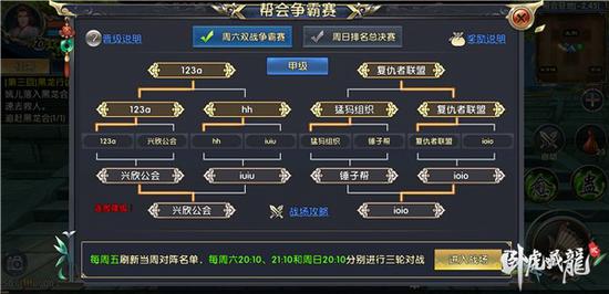 新玩法帮派联赛共分为三轮对战,每周六进行两轮,周日进行一轮。采取的对战制度为胜者对战胜者,败者对战败者,最终按照成绩排名,前两名晋级,最后两名降级。最高级为甲级组,最低级为癸级组。每周只保留甲乙丙三个组级的排名,丙级组最后两名之后的名额在下周对战表中重新安排前三日的帮会活跃度排名再次排序。