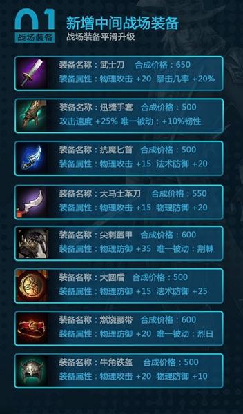 小编在游戏中发现,游戏战场中增加了武士刀、迅捷手套、抗魔匕首、大马士革刀、尖刺盔甲、大圆盾、燃烧腰带、牛角铁盔等八件装备。这些装备是合成终极装备的配件、价格相对较低,但实用性非常的强,可以让终极装备的合成更加平滑:在逆风局中,它们可以更好的帮助玩家抗住压力,平稳过渡;在顺风局中,也可以更有力的压制对手一锤定音。