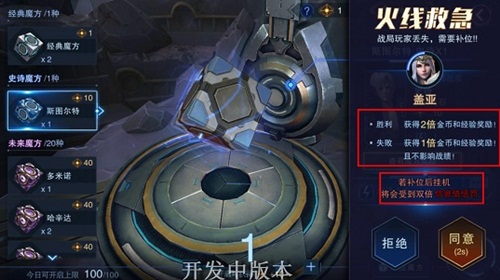 在新本中,如果有玩家挂机或者掉线,系统会自动向战场外的玩家发起邀请,让补位玩家继续完成比赛。此外,据小编亲身体验后发现,补位的玩家在获得胜利后,会获得更多的游戏奖励,即使对战失败也可以获得一定的奖励并且不会影响战绩,可以说是毫无后顾之忧!