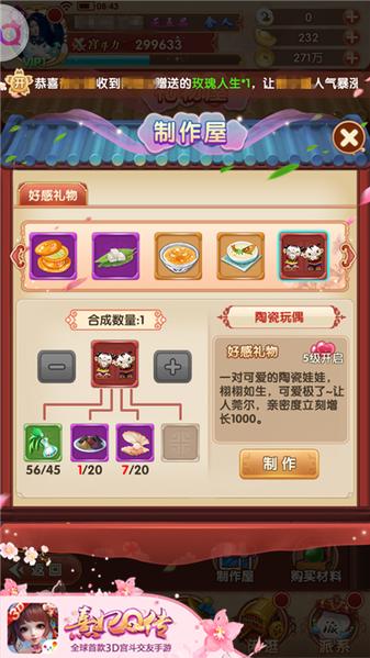 俗话说,少女情怀总是诗,对付慕凌惜公主这样的小姑娘,送礼物显然比纯聊天有用的多。每天游历和其他任务中都可以获得礼物制作的材料,制作后的礼物会存放在“礼物屋”种,点击送出即可,系统会根据礼物的贵重程度来增加你和公主不同的亲密度。