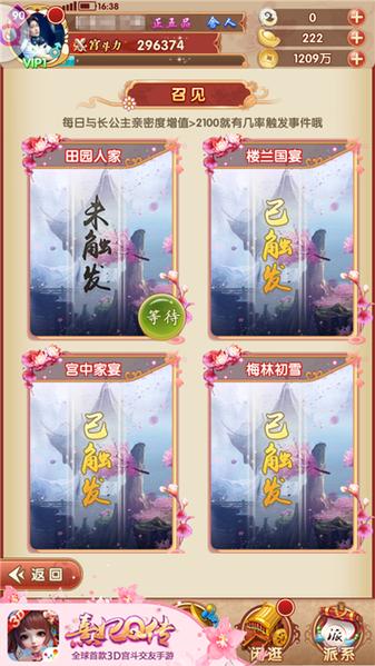 当每天与公主的亲密度大于规定数值的时候,就可以触发召见事件,在现有版本中,共有湖中垂钓、泡个温泉、田园人家、梅林初雪、宫中家宴、楼兰国宴六个事件,其中前三个事件只需点击进入,并且安静享受与公主在一起的30分钟美妙时光,即可进一步增加亲密度。
