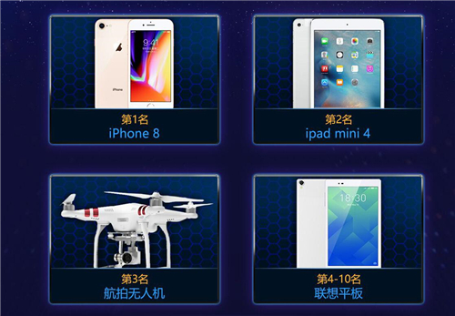 从这次的奖品来看,是非常丰富,前三名的iphone8、iPadmini4、 航拍无人机,都格外惹眼,而前10名都是联想平板电脑足以看出官方的诚意,大家千万别忘了,实体奖品如此丰厚,大家可千万不要错过哦。