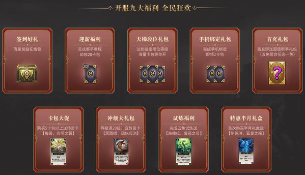 开服伊始,安卓玩家上线完成新手即可领取28个卡包,天梯段位达到白银、黄金、钻石、传说分别再送5、10、15、20卡包!另有天梯印卡、到达等级送橙卡、完成五色试炼送橙卡、半月礼盒送橙卡等九重福利!