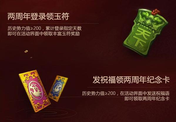 为了答谢两年来不离不弃,始终战斗在《率土之滨》沙场上的战略热爱者们,本次周年庆典活动,更是准备了海量福利。活动期间,只要历史势力值达到200,即可在“发祝福”活动中100%领取到二周年5星限定纪念卡。若每天连续登陆游戏,还可累积领取到超过1300玉符的高额奖励!