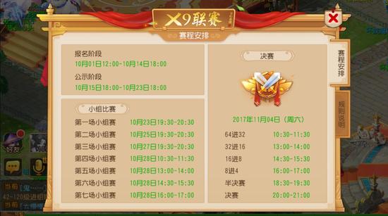 本届X9联赛,将采用小组赛和决赛相结合的形式,决出精锐、勇武、神威三大组别的最强者。在10月23日~10月28日期间,所有参赛战队将经历总共7场小组赛,而各自组别获得最高积分的64支战队,将在11月4日打响决赛。在经历6轮比赛之后,决出本届X9联赛对应组别的冠军。